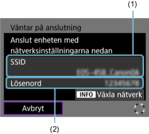 - Kontrollera SSID (1) och Lösenord som (2) visas på kameraskärmen.