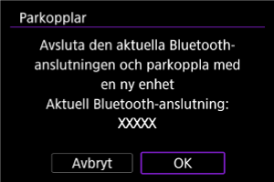 - Ett meddelande visas om kameran redan är parkopplad med en annan enhet. Välj [OK] för att avsluta nuvarande Bluetooth-anslutning.