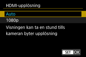 Ställ in upplösningen för utdata som används när kameran är ansluten till en TV eller extern inspelningsenhet med en HDMI-kabel.