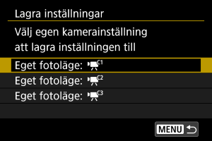 Med metoden kan du registrera aktuella kamerainställningar såsom inspelning, meny och inställningar för Egen programmering som Egna inspelningsmetoder tilldelade till metoderna [C1] till [C3].