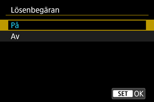 Du kan välja lösenordet som ska anges när strömbrytaren är satt till Påslagen eller om kameran startar om efter automatisk avstängning.