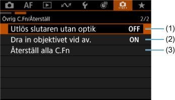 Att välja [: Återställ alla C.Fn] rensar alla inställningar för egen programmering.