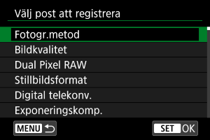 På Min meny kan du ändra ordning på de registrerade posterna. Välj [Sortera registrerade poster] och ett alternativ som du vill ordna om samt tryck sedan på