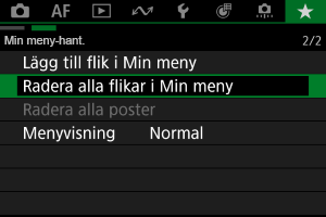 Du kan ta bort alla flikar i Min meny som har skapats. När du väljer [Radera alla flikar i Min meny] kommer alla flikar från [MY MENU1] till [MY MENU5] att raderas och []-fliken återgår till sin grundinställning.
