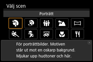 Använd [] (Porträtt) för att göra bakgrunden suddig och få personen du fotograferar att bli mer framstående. Den får även hudton och hår att se mjukare ut.