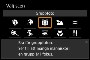 Använd [] (Gruppfoto) för at fotografera grupper. Du kan fotografera med människor från första till sista personen och allt i fokus.