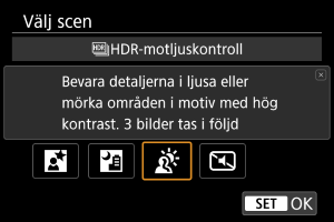 HDR-motljuskontroll) för motljusscener med både ljusa och mörka områden. Att fotografera en gång i det här läget tar tre bilder i följd med olika exponeringar. Dessa kombineras sedan för att skapa en enda HDR-bild som bibehåller detaljer i skuggor som annars skulle kunna gå förlorade från motljus.