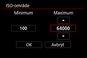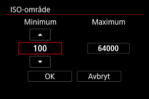 Du kan ställa in det manuella intervallet för ISO-talet (minsta och högsta värde).