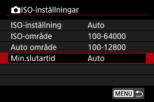 För att förhindra att slutartiderna ställs in för lågt automatiskt kan du ställa in minsta slutartid för ISO Auto.