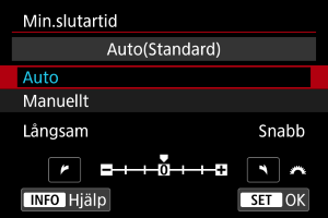 - När [Auto (Standard)] har ställts in kommer den minsta slutartiden vara samma som den för objektivets brännvidd. Ett steg från [Långsam] till [Snabb] motsvarar ett steg för slutartiden.