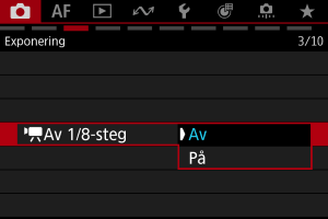 Bländarvärden kan ställas in i steg om 1/8 steg för filminspelning med RF-objektiv. Tillgängligt med inspelningsmetoderna [], [], [] eller [].