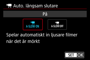 Du kan välja om du vill spela in filmer som är ljusare och med mindre brus än när inställningen är inställd på [Av] genom att automatiskt göra slutartiden långsammare vid svagt ljus.