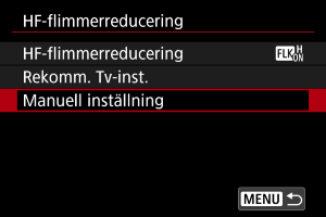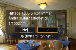 Kameran detektera ljuskällor med 50,0–2011,2 Hz och visar en lämplig slutartid för fotografering under ljuskällor som flimrar med höga frekvenser. Du kan sedan byta till den angivna slutartiden.