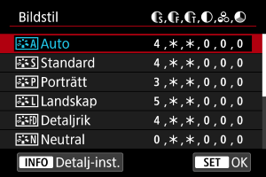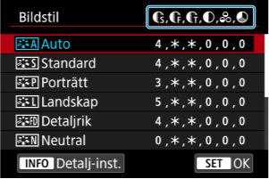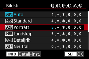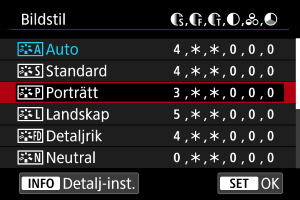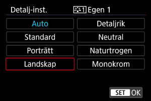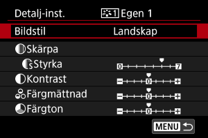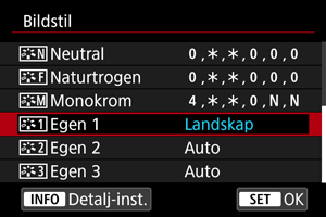 Du kan välja en bildstil såsom [Porträtt] eller [Landskap] samt justera den efter önskemål och registrera den under [Egen 1] – [Egen 3]. Användbart när du skapar flera bildstilar med olika inställningar.