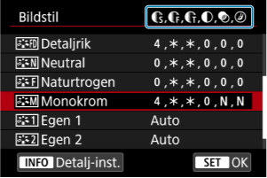 Du kan anpassa en bildstil genom att ändra standardinställningarna. Mer information om [Monokrom] finns i Monokrom inställning.