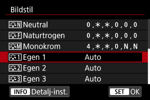 - Om du vill fotografera med en registrerad bildstil väljer du den registrerade [Egen *] och tar sedan bilden.