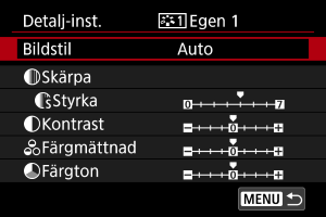 - Om en bildstil redan har registrerats under [Egen *] kan du radera parameterinställningarna för den registrerade bildstilen genom att ändra egen bildstil.
