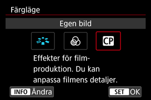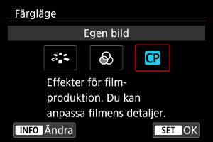 Du kan ställa in önskade film- eller stillbildsegenskaper i menyerna Bildstil, Färgfilter eller Egen bild.