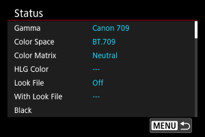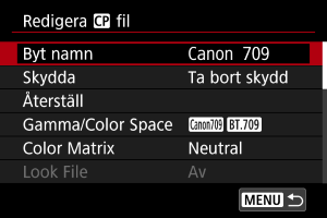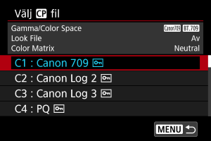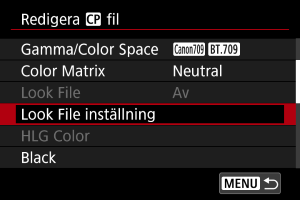 - Välj [Av] för att inaktivera färgjusteringen baserat på look-filer.