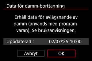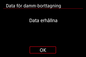 Kameran lägger till de data för dammborttagning som hämtas till alla bilder från och med nu. Hämta data för dammborttagning före bildtagning rekommenderas.