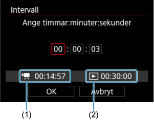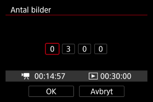 Indikerar tiden som krävs för att ta antalet bilder med det angivna intervallet. Om tiden överskrider 24 timmar visas ”*** dagar”.
