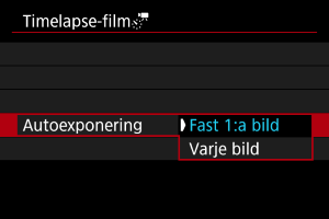 - När [Autoexponering] är inställd på [Varje bild] kommer ISO-tal, slutartid och bländarvärde inte att sparas i timelapse-filmens Exif-information med vissa fotograferingsmetoder.