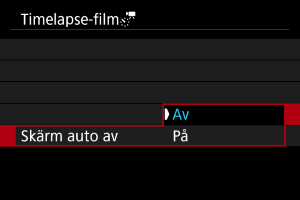Även vid inspelning av timelapse-film visas bilden. (Skärmen stängs av bara vid tiden för inspelning.) Observera att skärmen stängs av när ca. 30 min har gått efter att fotograferingen började.