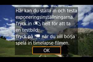 - Du rekommenderas att ta testbilder såsom i steg 13 och att spela in tester med timelapse-filmer i förväg.