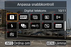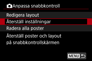 - Välj [Återställ inställningar] för att återställa standarposterna och -layouten för snabbkontrollskärmen.