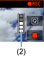 Om du använder ett kort med låg skrivhastighet kan en indikator visas till höger på skärmen under filminspelningen. Indikatorn visar hur mycket data som ännu inte har skrivits till kortet (återstående kapacitet i det interna buffertminnet) och det ökar snabbare ju långsammare kortet är. Om indikatorn (2) blir full avslutas filminspelningen automatiskt.