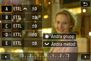 - Inställningarna (blixtmetod och blixtexponeringskompensation) för varje blixtgrupp visas.