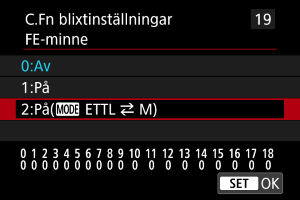 Du kan ställa in blixtstyrkan som registreras med blixtmetoden [ETTL] som blixtstyrkan för blixtmetoden [M] genom att trycka på knappen som är tilldelad [ETTL M (med FEM aktiverat)] (med FEM aktiverad) i [