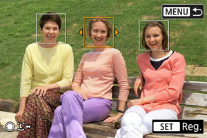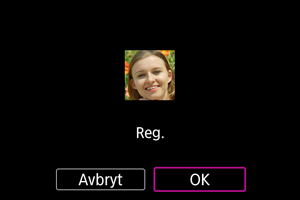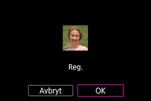 Du kan registrera personer på kameran för att låta den känna igen deras ansikten och prioritera fokusering, ljusstyrka och färgton för dem vid fotografering. Du kan ta en bild på någon eller använda en bild på kortet för att registrera ett ansikte.
