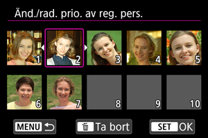 Du kan ordna om registrerade personer för att ändra prioriteten för igenkänningen. Du kan även ta bort registrerade personer.