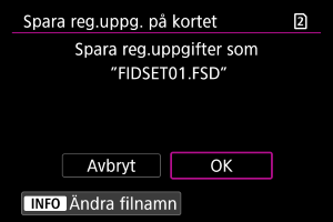 - Välj [Spara reg.uppg. på kortet] för att spara kamerans registrerade data på kortet.
