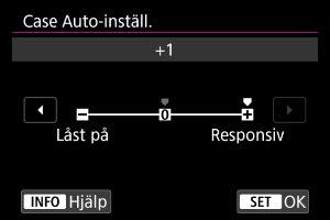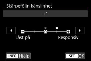 Kameran försöker fortsätta fokusera på motivet även om ett icke-motiv förflyttar sig över AF-punkterna eller om motivet kommer bort från AF-punkterna. Inställningen -2 gör att kameran följer målmotivet längre än med inställningen -1.