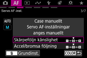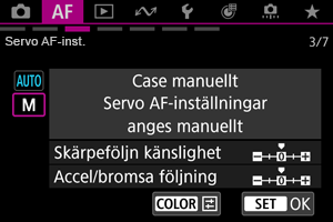 Du kan ställa in följningsparametrar för Servo AF (motivets skärpeföljn känslighet och accelerations-/retardationsföljning) beroende på motivet och fotograferingssituationen.