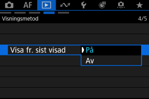 ]: Bildvisningen återupptas från den sist visade bilden (förutom om du just har avslutat fotograferingen).