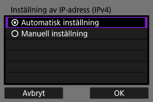 - Om skärmen [Inställning av IP-adress (IPv4)] visas ska du gå till Ställa in IP-adressen.