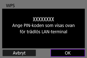 Det här är ett anslutningsmetod som kan användas om kopplingspunkten är kompatibel med WPS. I läget för anslutning med PIN-kod (PIN-läge) upprättas en anslutning genom att du på kopplingspunkten anger ett åttasiffrigt identifieringsnummer som specificerats på kameran.