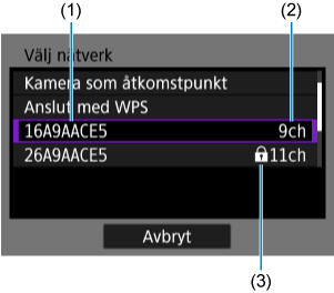 - Tomt utrymme i (2) indikerar att flera SSID:er med samma namn detekterades. Om du väljer ett SSID där (2) är tomt ansluts kameran till den åtkomstpunkt som har den starkaste signalen.