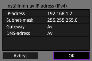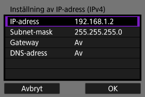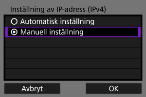 Ställ in IP-adressen manuellt. Observera att alternativen som visas varierar beroende på kommunikationsfunktionen.