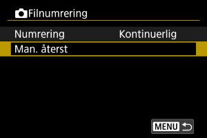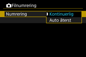 Observera att filnumrering kan fortsätta från alla befintliga bilder på kort eller mappar som du byter till. Om du vill ha kontinuerlig filnumrering rekommenderas du att använda ett nyformaterat kort varje gång.