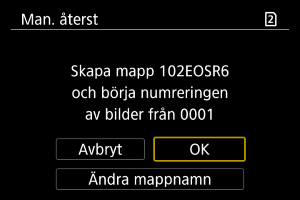 När du återställer filnumreringen manuellt skapas en ny mapp automatiskt och filnumreringen för bilder som sparas i mappen börjar på 0001.