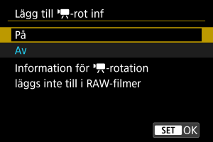 För filmscener som spelas in med kameran vertikalt kan orienteringsinformation som indikerar vilken sida som är upp läggas till automatiskt för att aktivera visning i samma orientering på smartphones eller andra enheter.