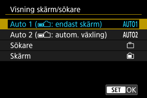 Du kan ange att använda skärmen eller sökaren för visning för att undvika att aktivera sökarsensorn av misstag när skärmen är öppen.