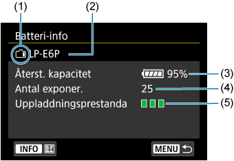 - Återstående kapacitet i steg om 1 % visas inte om batterierna LP-E6NH/LP-E6N eller batterihandgreppet BG-R10 används. Dessa batterier kan dessutom inte registreras.