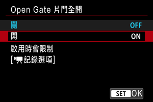 當設定或使用以下任何功能時,「Open Gate 片門全開」功能將會關閉。