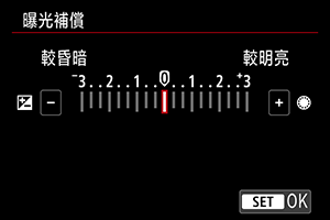 您可以向正或負方向設定曝光補償,以加亮(增加曝光)或減暗(減少曝光)相機設定的影像標準曝光。