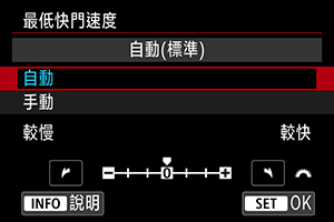 - 設定為[自動 (標準)]時,最低快門速度將為鏡頭焦距的倒數。[較慢]至[較快]之間的各個級別相當於每一級快門速度。